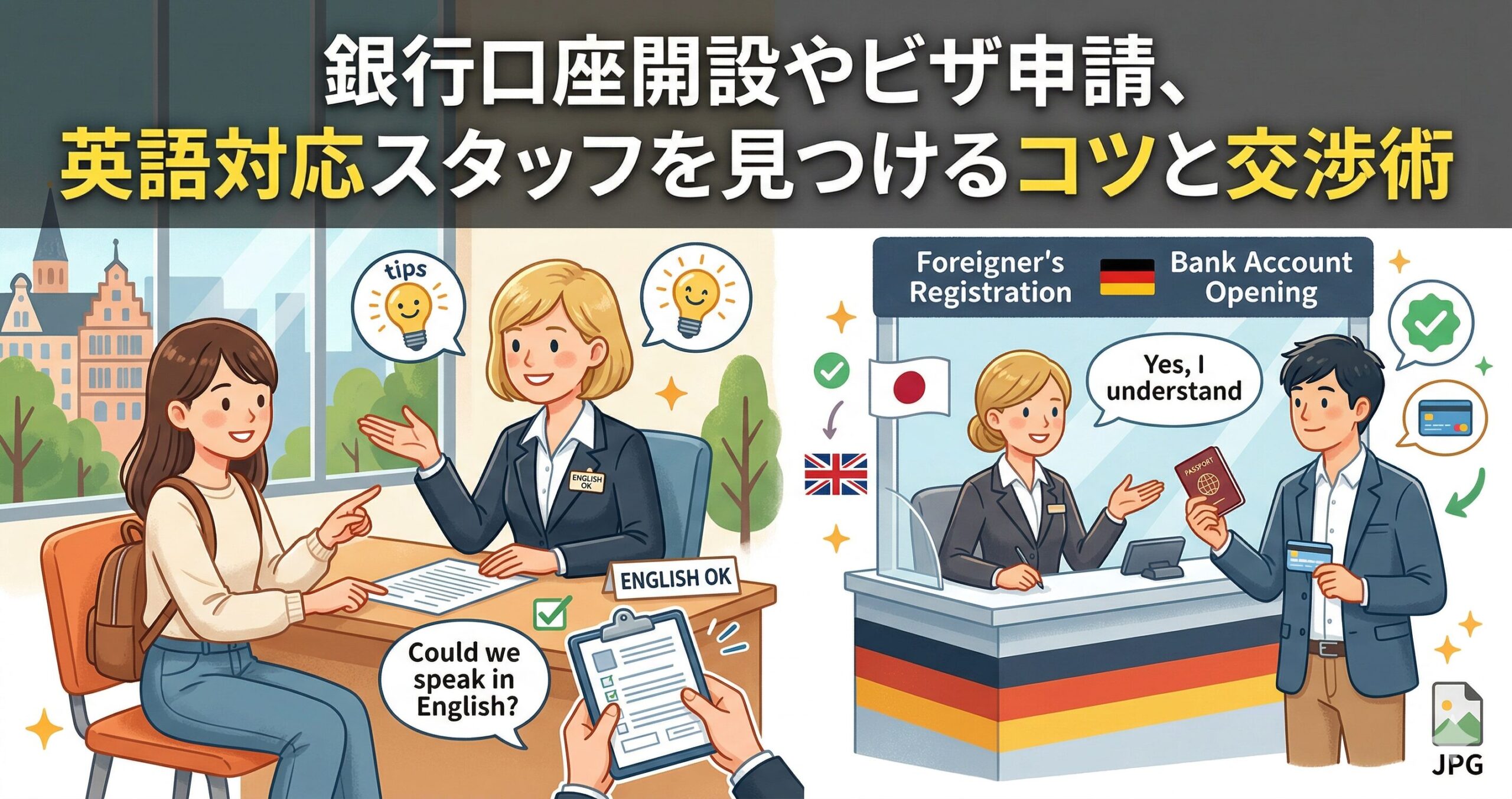 しかし、だからといって英語が全く通用しないわけではありません。担当者個人の裁量や親切心、あるいは事前の準備次第で、英語での手続きが可能になる余地は十分にあります。私自身、2003年にフランクフルトの銀行で口座を開設した際、最初は手続き書類の難しさに戸惑いましたが、担当者が英語で補足説明をしてくれたおかげで無事に手続きを終えることができました。