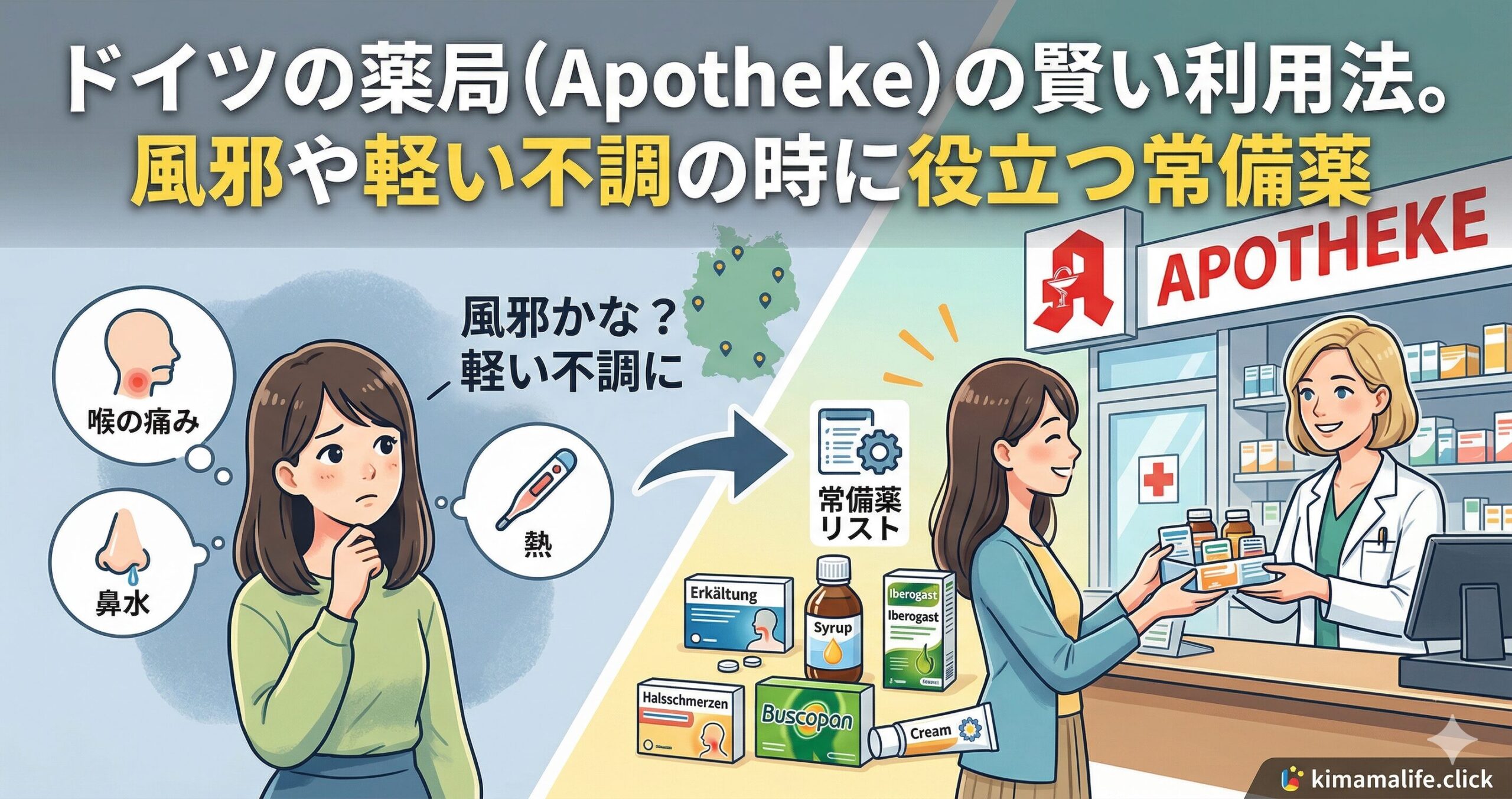 ドイツでの生活や旅行中、慣れない環境や寒さから体調を崩してしまうことは誰にでもあるものです。そんな時、心強い味方になってくれるのが街のあちこちにある「Apotheke(アポテーケ)」と呼ばれる薬局です。しかし、日本のドラッグストアとは仕組みが少し異なるため、「どうやって薬を買えばいいの?」「ドイツの薬は強すぎない?」と不安に思う方も多いのではないでしょうか。